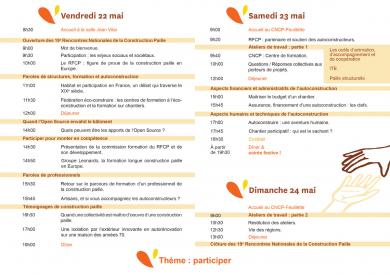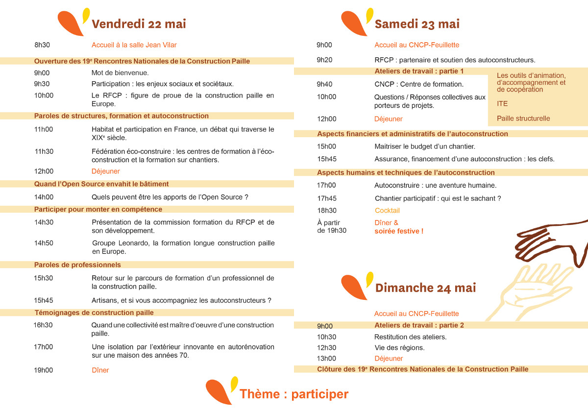 La participation bouleverse toutes les sphères, les unes après les autres. La construction paille, et la construction en général, ni échappe pas. “Participer” sera donc le fil d’Ariane de ces Rencontres de printemps. De l’expérience novatrice issue du mouvement "Les castors" jusqu’à l’open-source, l’échange et le partage seront au cœur de ces trois journées.