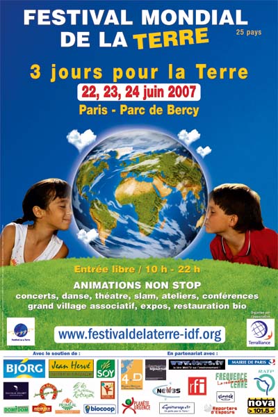L'association TERRALLIANCE organise annuellement le Festival Mondial de la Terre, événement qui dure une semaine et qui porte les valeurs de RESPECT de la PLANETE et de SOLIDARITE. Pour sa 3ème édition, le Festival de la Terre aura lieu du 18 au 24 juin 2007 et verra la mobilisation d'écoles, associations, universités, entreprises, collectivités dans 40 pays sur les 5 continents et au moins dans 40 villes et villages de l'hexagone. L'évènement se déroulera également à Paris du 22 au 24 juin prochain de 10h à 22h (entrée libre) au Parc de Bercy (au pied du Palais Omnisports de Paris Bercy) avec la configuration suivante : - 60 associations présentes