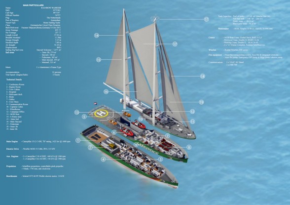 Le Rainbow Warrior III est aussi un guerrier conçu pour agir : ses grues situées à l’avant et à l’arrière du bateau permettront l’embarquement d’équipements scientifiques volumineux, pouvant peser jusqu’à huit tonnes. Grâce à l’espace flexible qu’offrira le bateau, les scientifiques auront la possibilité d’effectuer leurs analyses à bord, sans devoir attendre de retourner sur la terre ferme. Avec une vitesse de pointe de 15 nœuds, le Rainbow Warrior III pourra suivre de près les navires industriels. Des bras articulés permettront de mettre à l’eau en quelques minutes les trois zodiacs du Rainbow Warrior III, même avec des vagues de 3,5 mètres de haut.